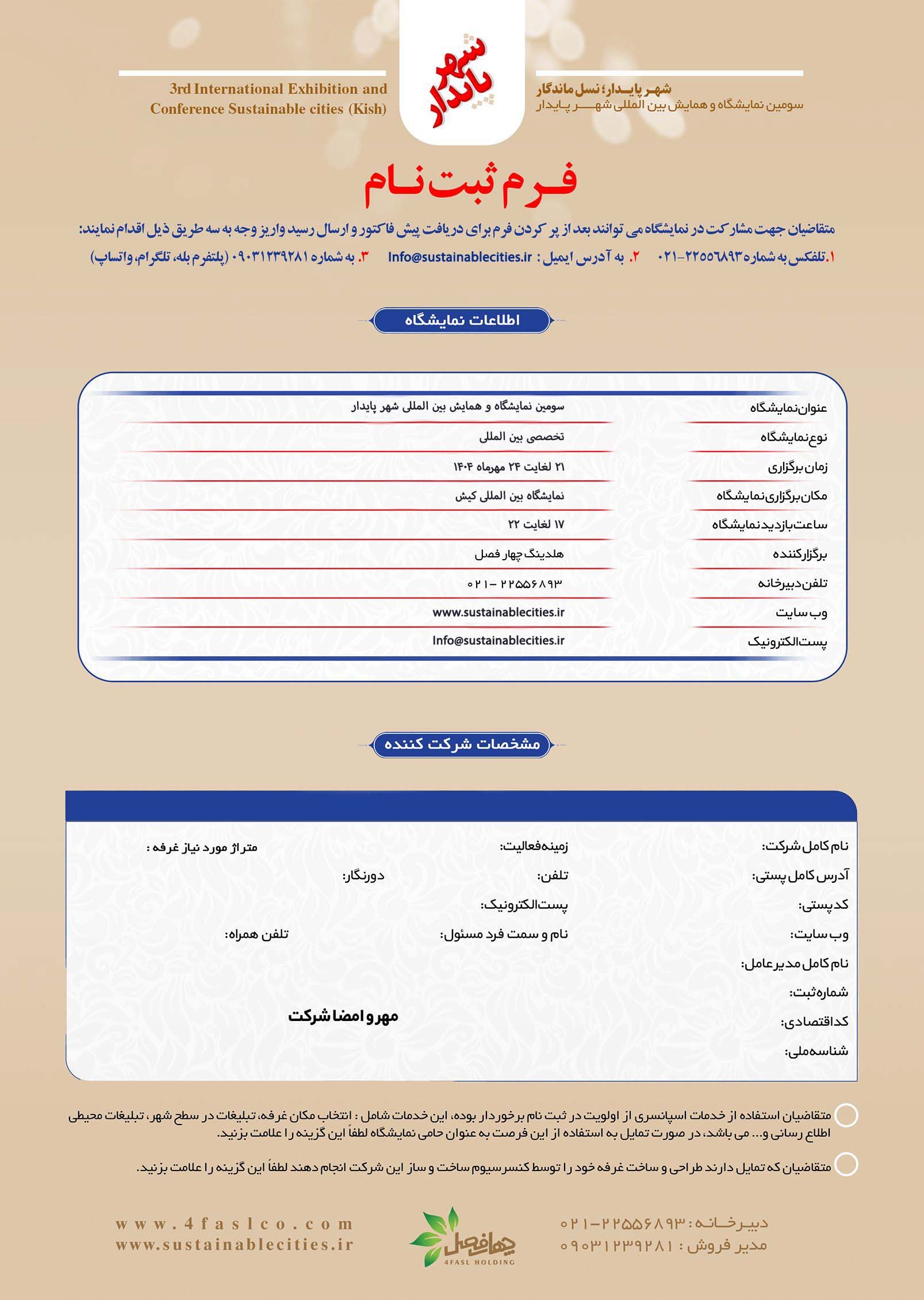 جهت شرکت در همایش بین المللی فرصت های سرمایه گذاری و تامین مالی پایدار لطفا فرم زیر را تکمیل و به ایمیل نمایشگاه به ادرس Info@sustainablecities.ir ارسال بفرمایید.